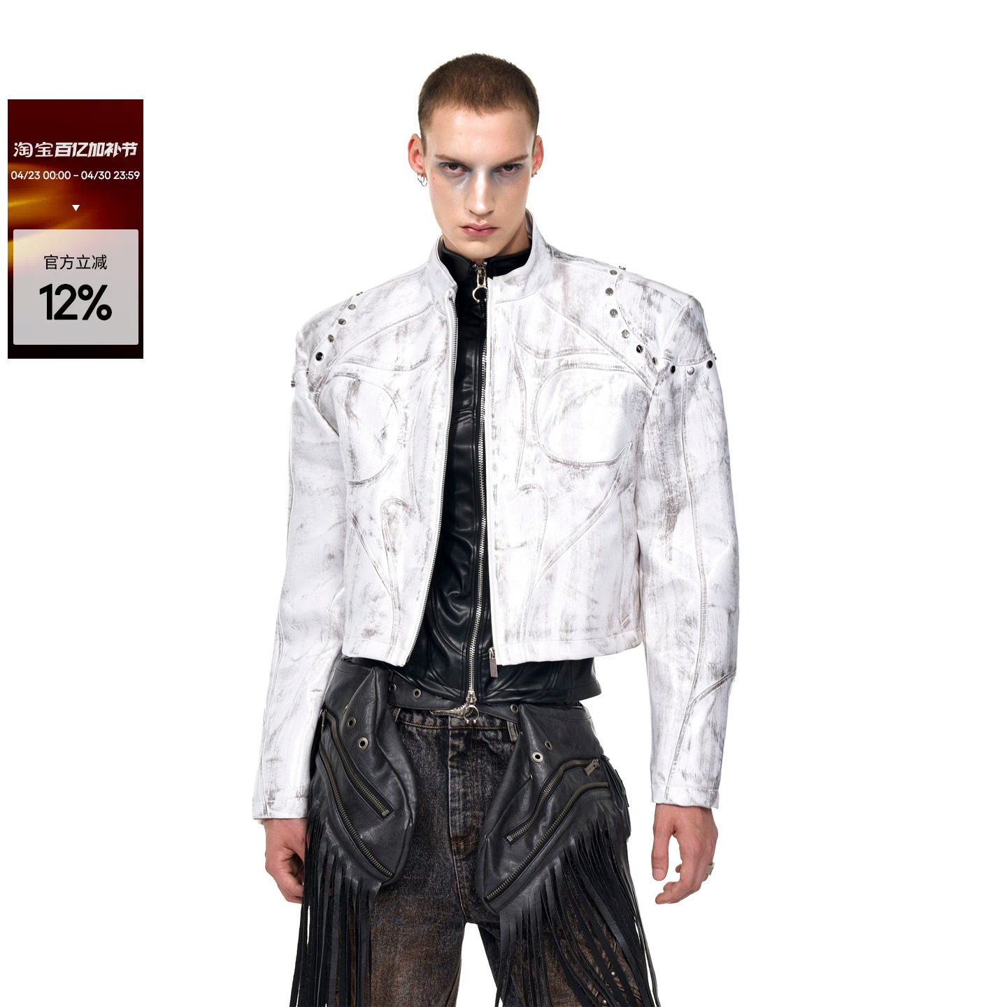 SEE white short stand-up collar leather jacket jacket men's autumn new product shoulder pad leather jacket men's ruffian handsome motorcycle suit trend