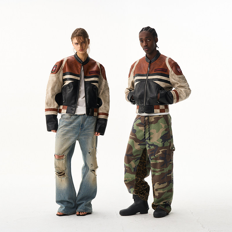 Escape from Guangfu South American retro loose-leaf deconstruction tie-dye PU leather motorcycle leather jacket men's and women's trendy short and wide jackets