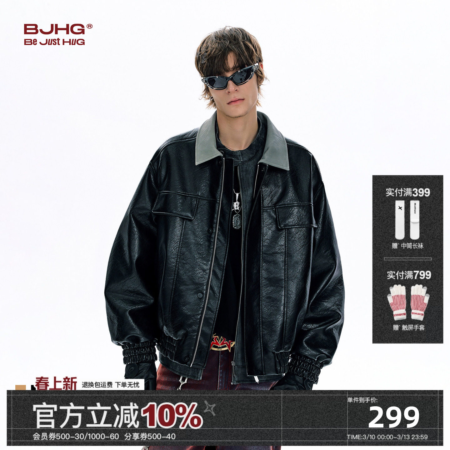 BJHG reckless American leather jacket men's spring 2026 new trendy contrast color simple short and wide jacket women