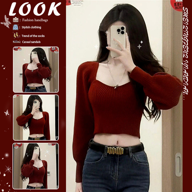 Slim and slim hot girl New Year's early spring outfit red sweater with underwear underwear Women's spring and autumn cropped knitted sweater top