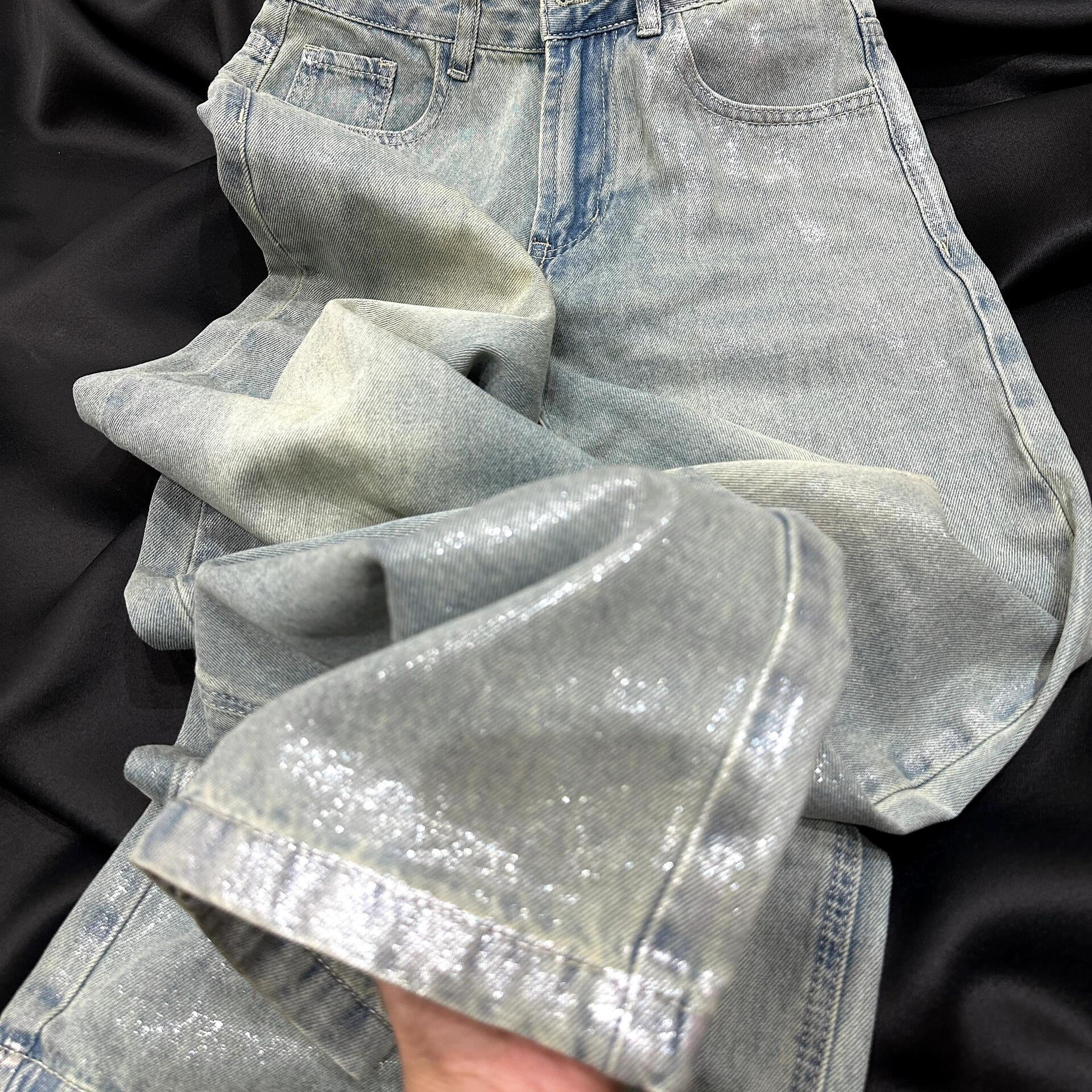 Design hot silver loose straight jeans women's spring new American high-waisted slimming drape floor-length wide-leg pants