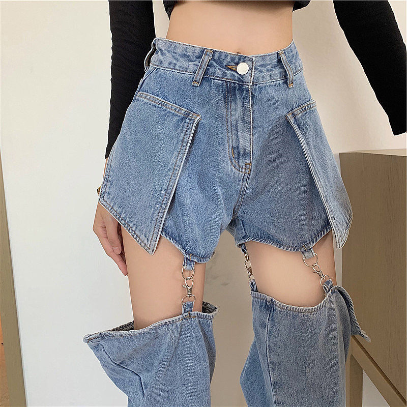 Gold Korean hot girl jeans women's summer high-waisted straight-leg pants loose slimming design pants detachable shorts