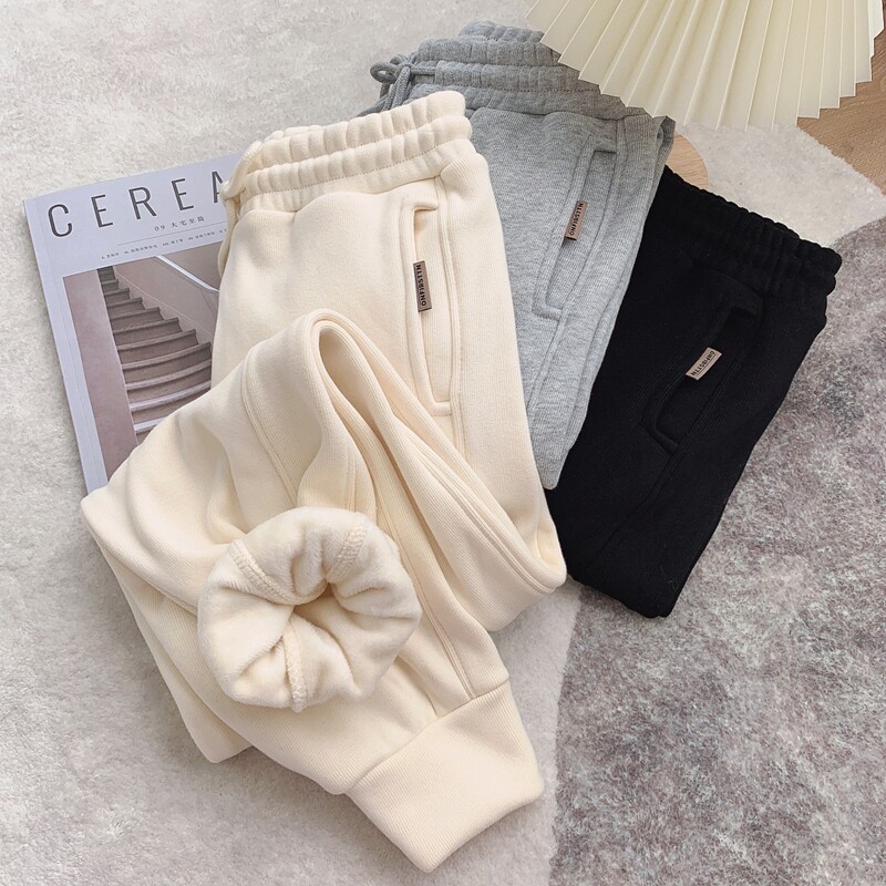 Fleece thickened small standard sports sweatpants women's autumn and winter ins beige elastic waist loose leg corset casual harem pants trend