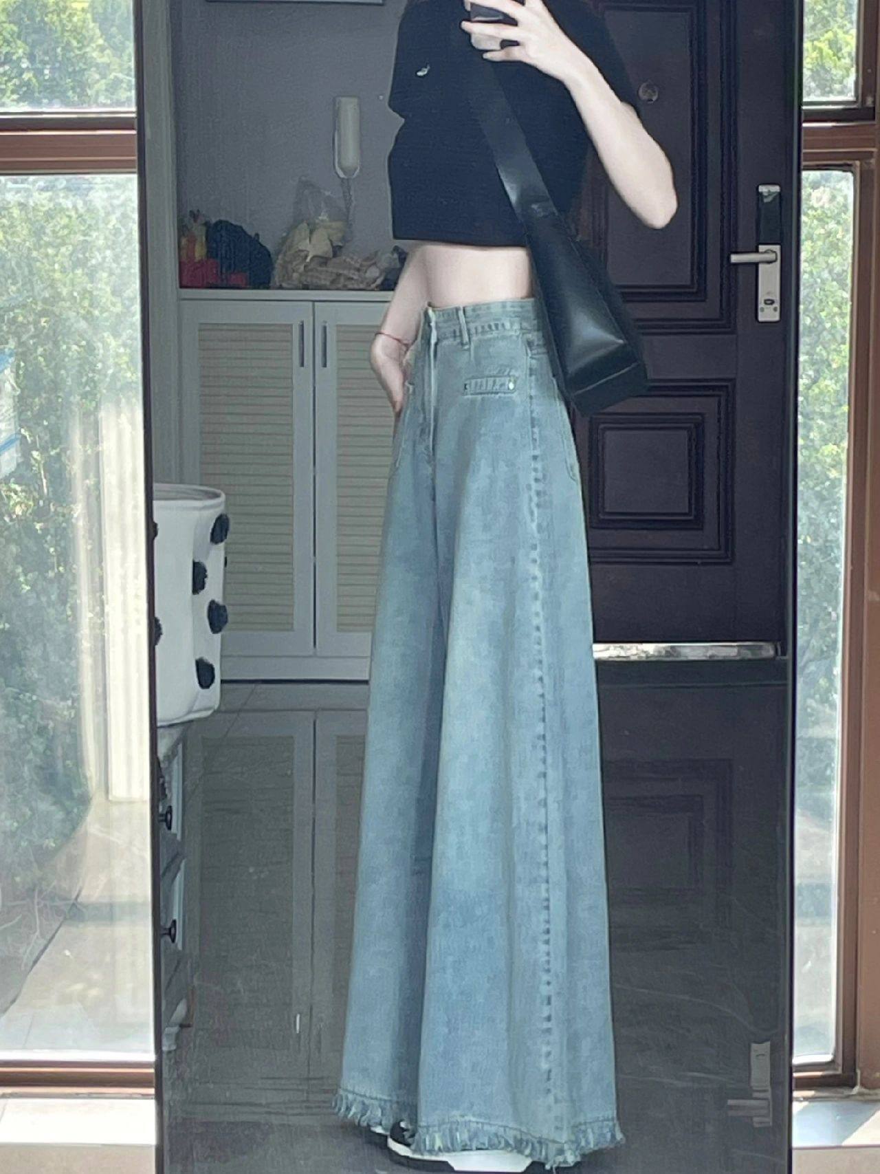Light blue wide-leg raw edge jeans women's spring new high-waisted slimming design drape floor-length pants ins
