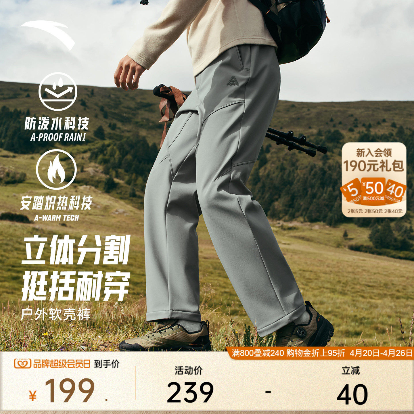 Anta's shell soft-shell scimitar pants with fleece trousers, men's winter straight-leg slacks, outdoor hiking pants