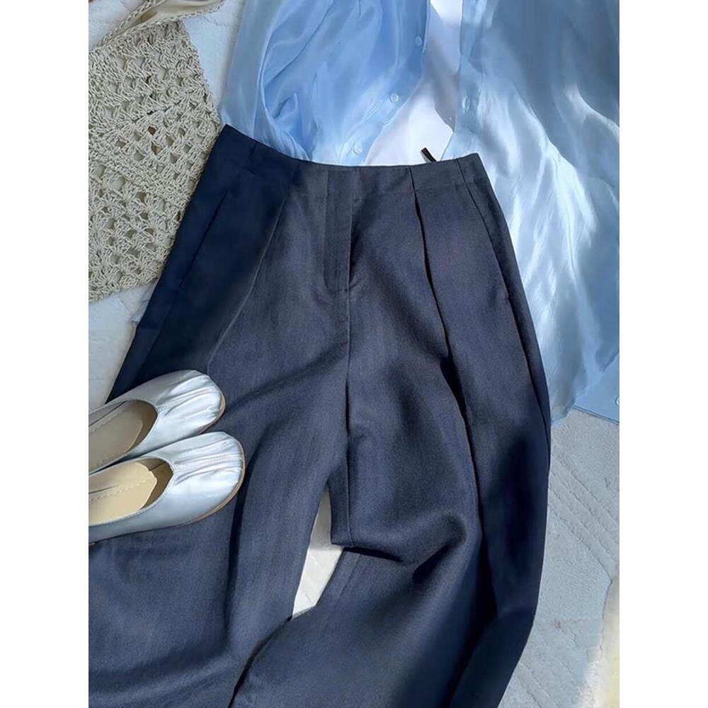 CHAO level recommendation! Old money style navy blue slacks women's summer high waist pressed pleated fashion linen suit pants