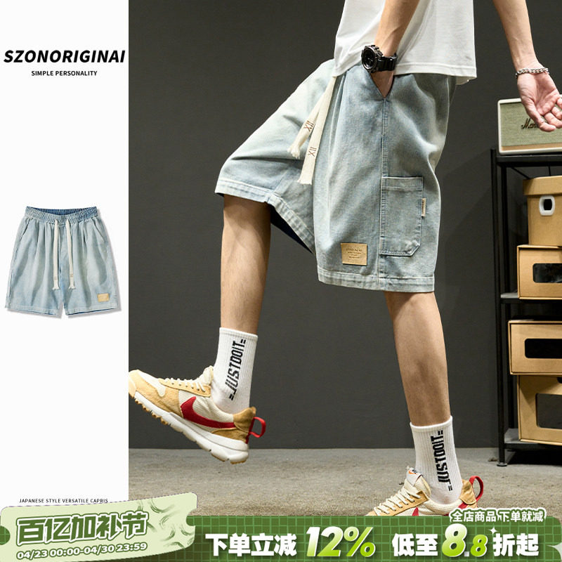 Denim shorts men's summer ins trendy brand washed old straight breeches Japanese retro workwear cropped pants thin style