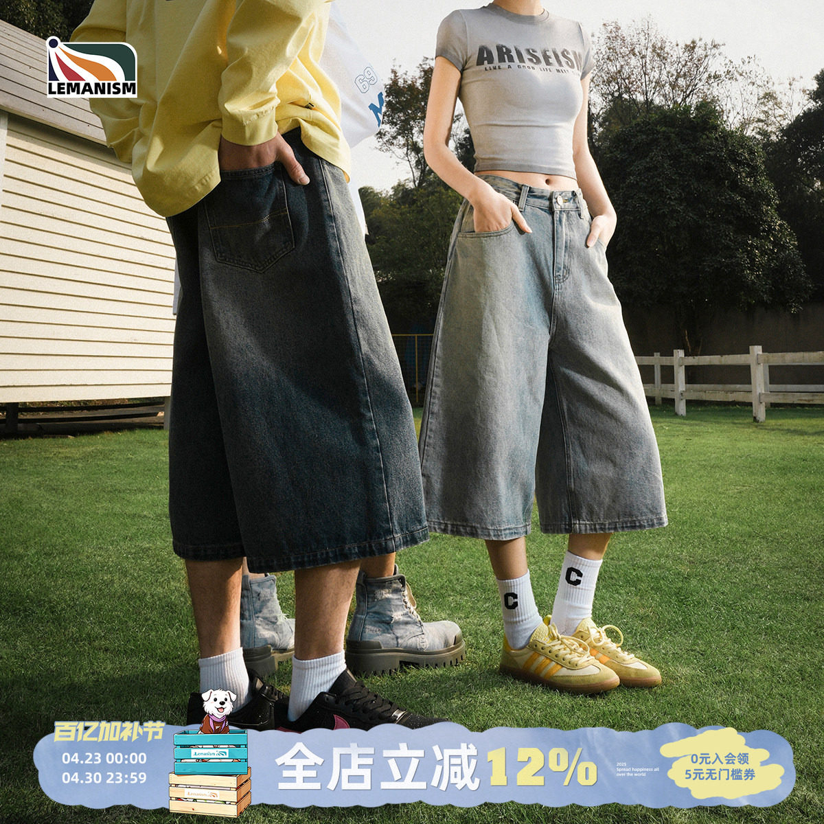 Lemanism American washed denim shorts men's summer casual mids cropped pants trendy couple straight-leg pants