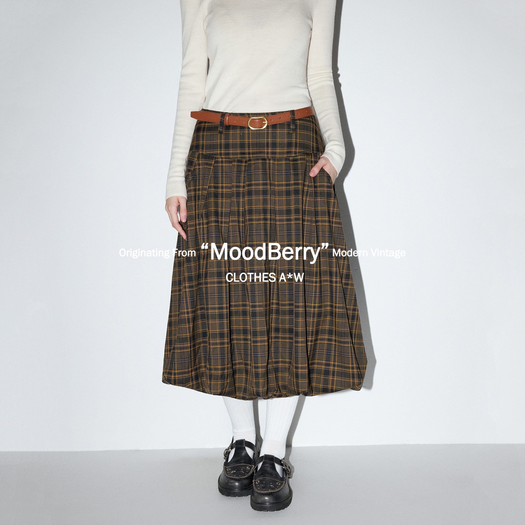 MoodBerry American Vintage Brown Check Skirt Women's Fall and Winter High Waist Midi Length A-Line Flower Bud Skirt
