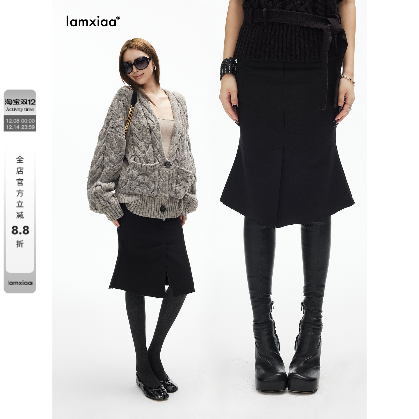 iamxiaa* worsted wool twill wool front center slit slimming split irregular hem fishtail hip skirt
