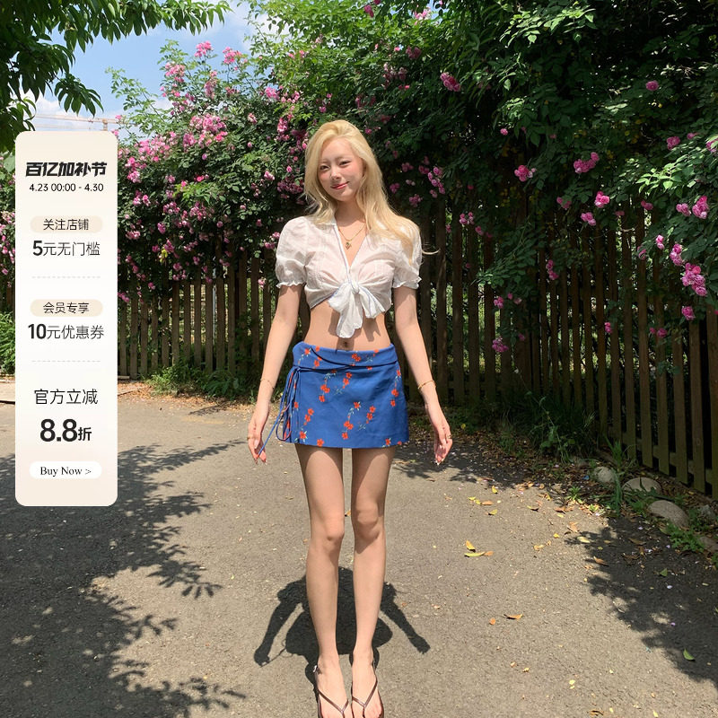 8uioio Greek style blue floral skirt women's summer 2026 new small A-line skirt short skirt