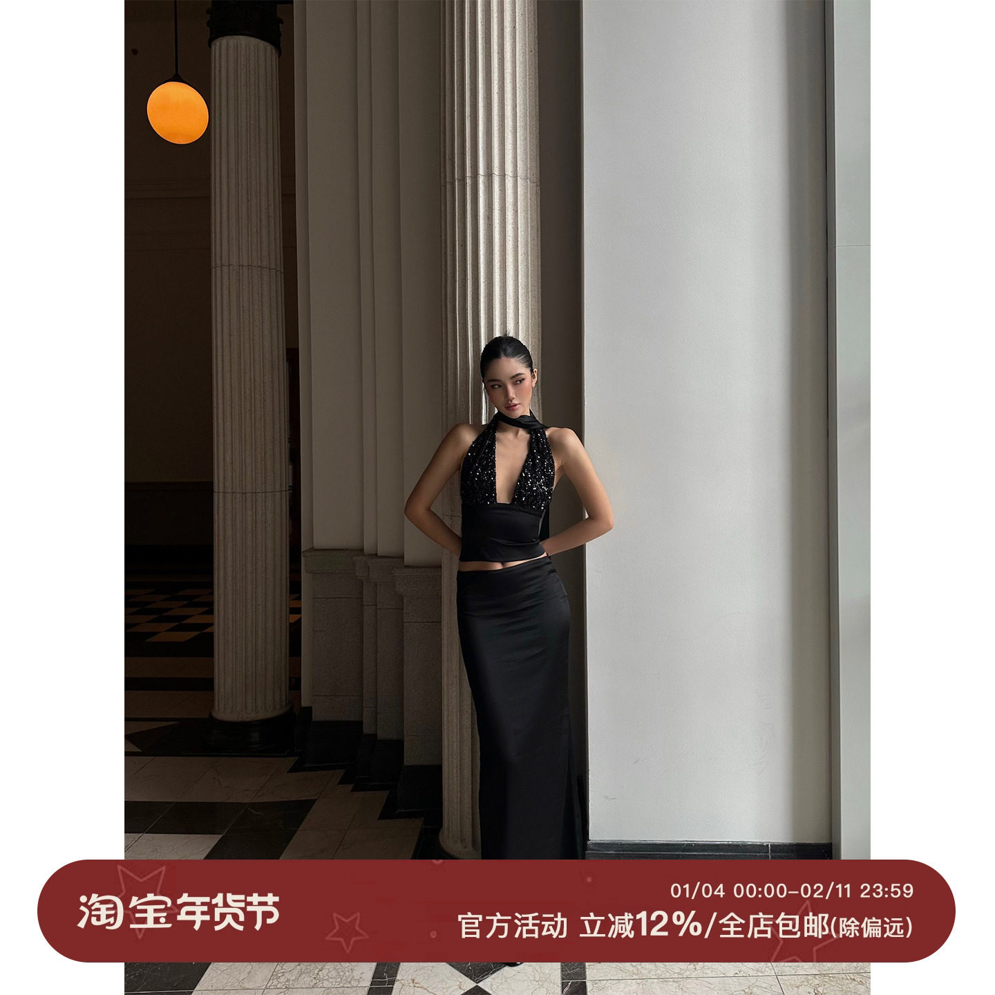 rovente Under the Night High-end black satin skirt with a slim temperament and a low-waisted long hip-hugging skirt