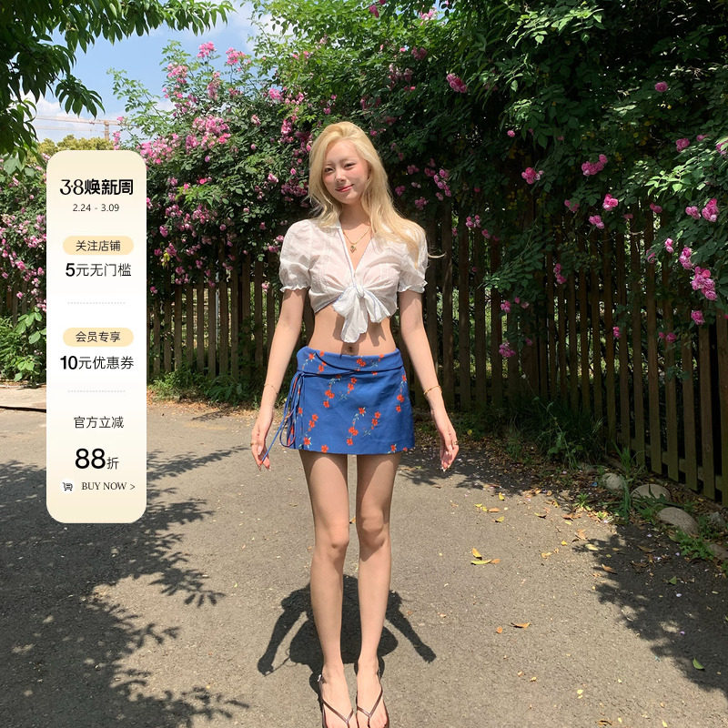 8uioio Greek style blue floral skirt women's summer 2026 new small A-line skirt short skirt