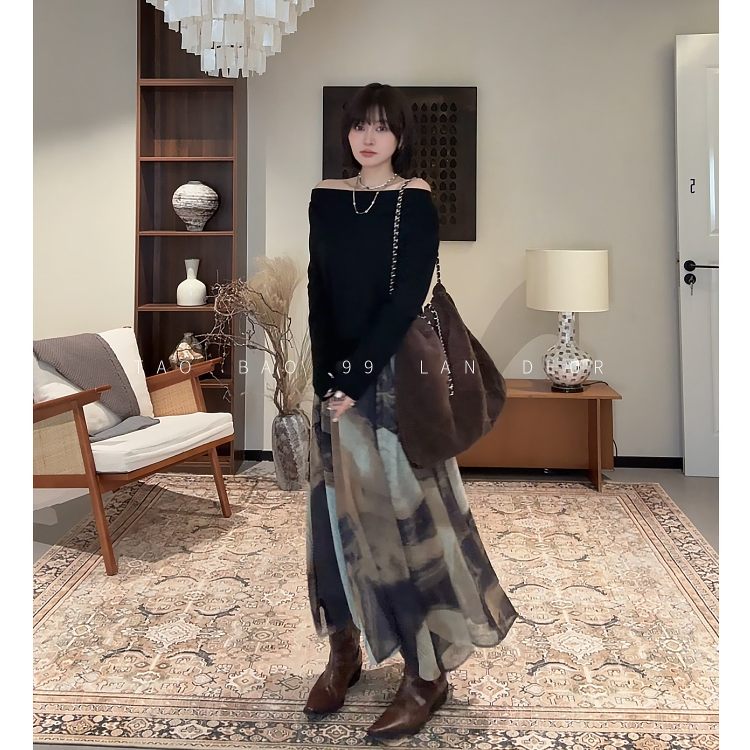 LAN DEUR [Gallery Walk] Atmosphere, retro art, oil painting, blended long skirt, high-waisted skirt