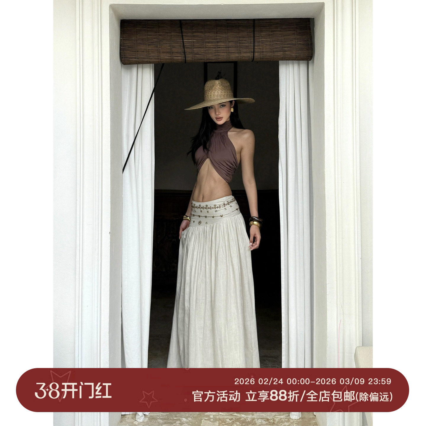 rovente Bohi Resort off-white A-line skirt women's spring thin skirt holiday vintage low-waisted long skirt