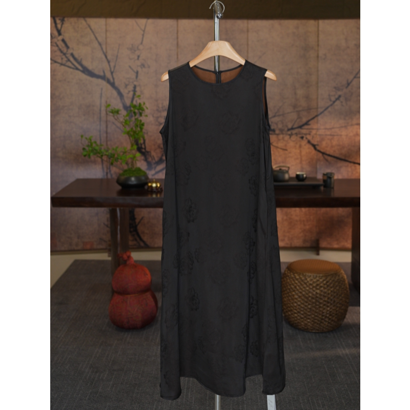 National style new Chinese black high-end floral jacquard vest dress with a belt