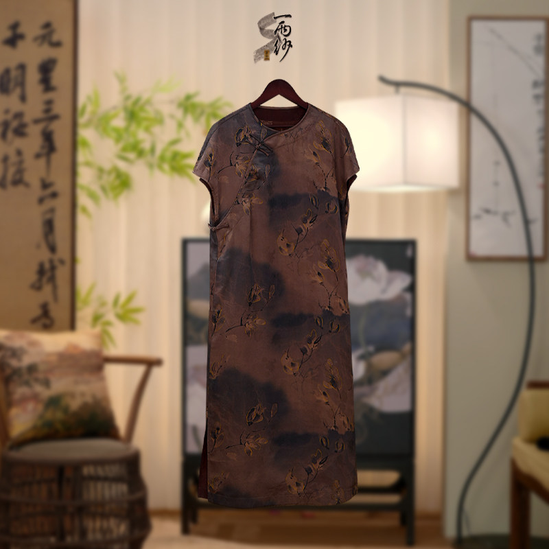 Yunshu original flower Luo fragrance cloud yarn new Chinese retro buckle silk mulberry silk improved round neck cheongsam dress