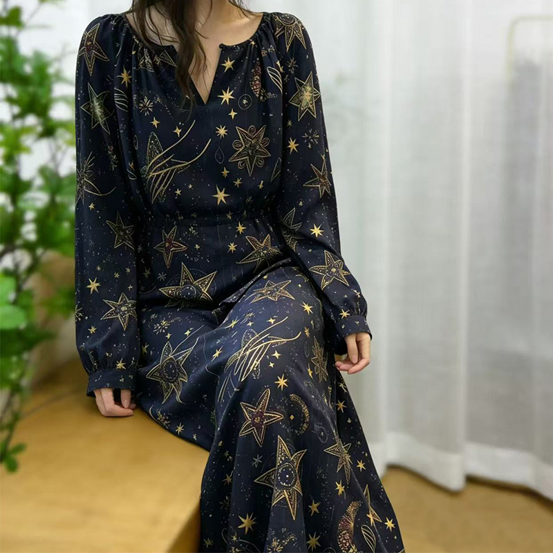 Yunshu original flower Luo fragrant cloud gauze inverted long-sleeved dress, mulberry silk print, literary and artistic temperament, round neck long skirt
