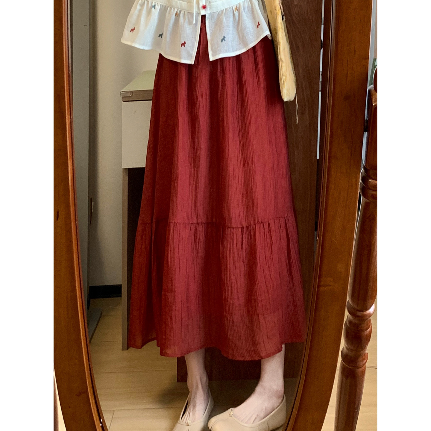 CHICHI retro red ~ Tencel texture is elegant and versatile, elastic waist skirt, double-layer skirt