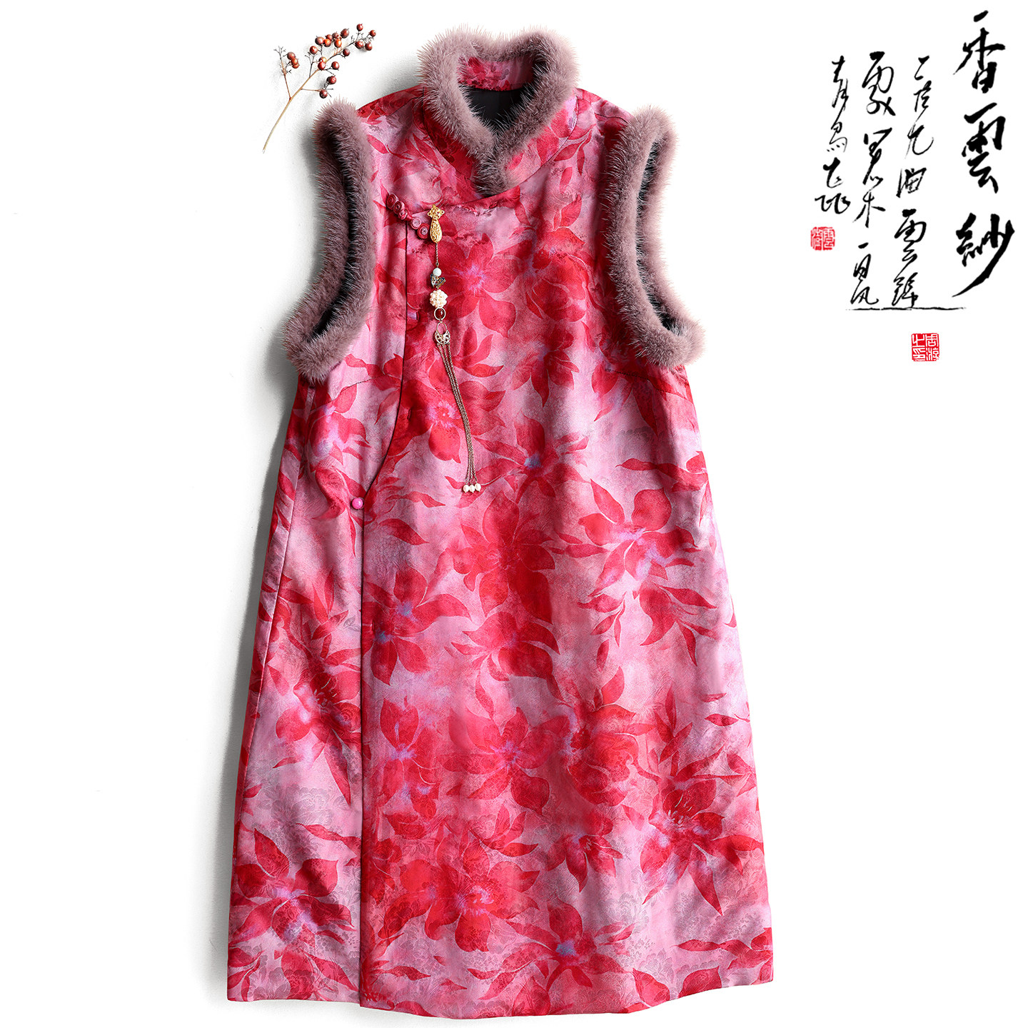 Yunshu original interwoven fragrant cloud yarn new Chinese style mink wool stand-up collar flower plate buckle plus cotton vest dress winter