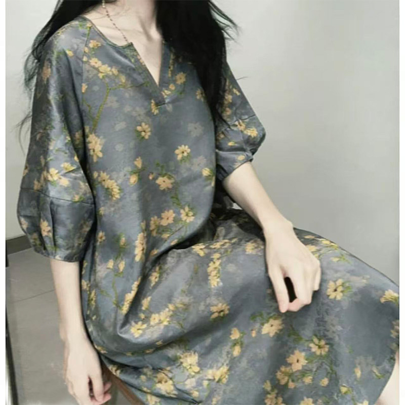 Yunshu original women's clothing, Chinese style interwoven fragrant cloud yarn print long dress, summer V-neck fashion temperament A-line skirt