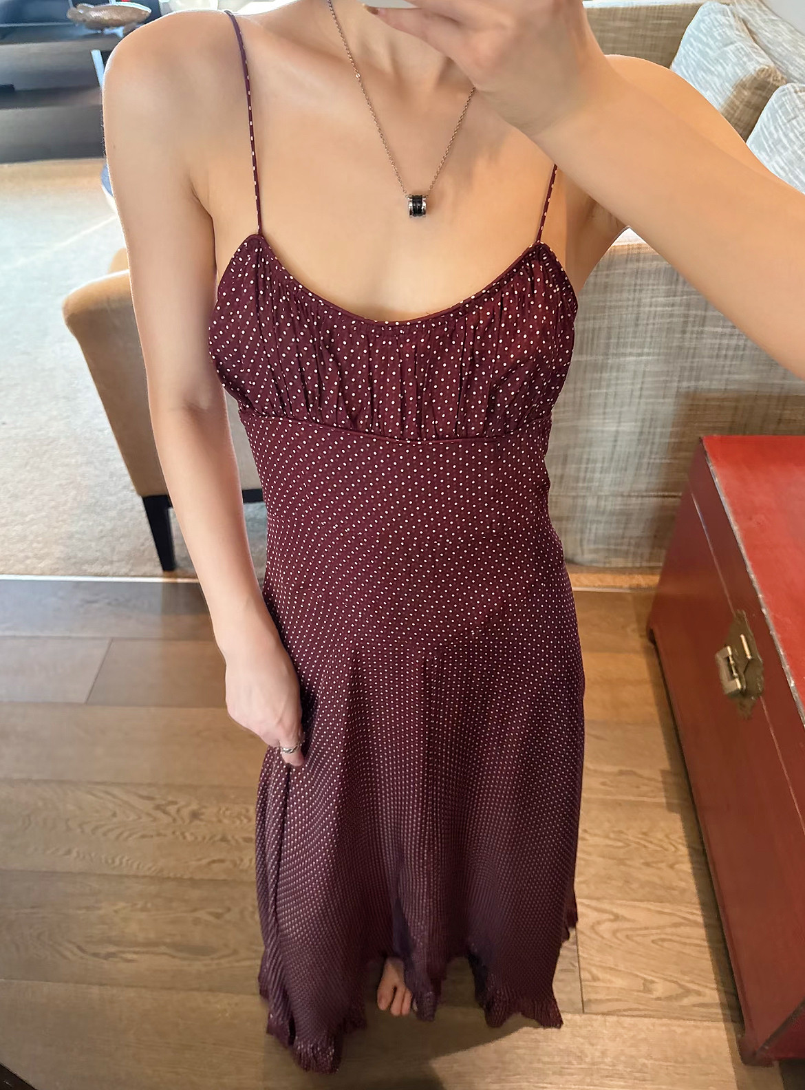 Summer 2026 French Vintage Silk Polka Dot Burgundy Print Dress Resort Mulberry Silk Suspender Long Skirt