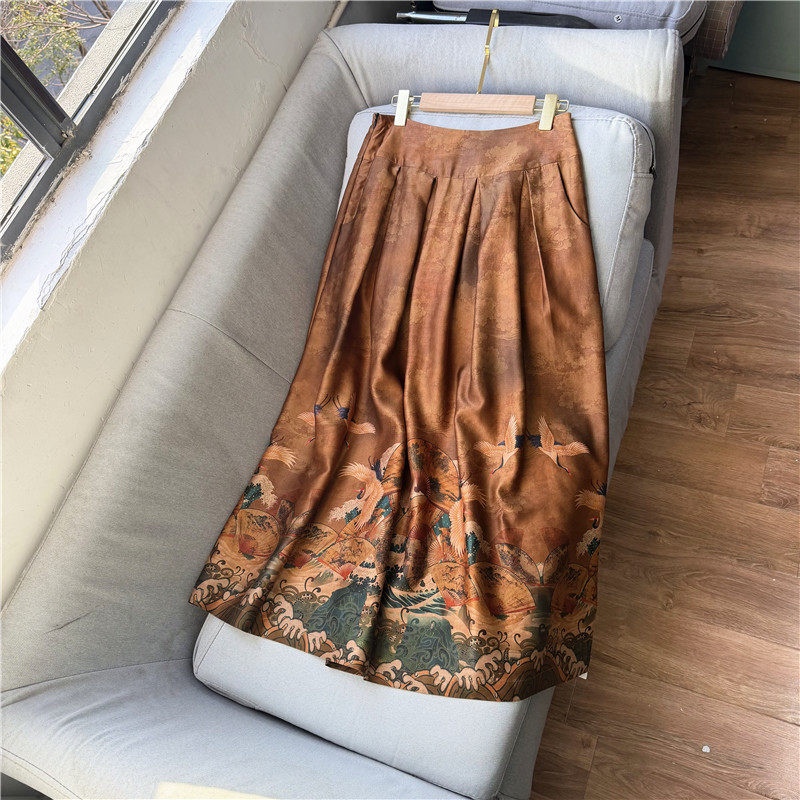 Zheng willful Chinese positioning flower heavy satin cloud gauze silk skirt high waist national style crane large swing long skirt