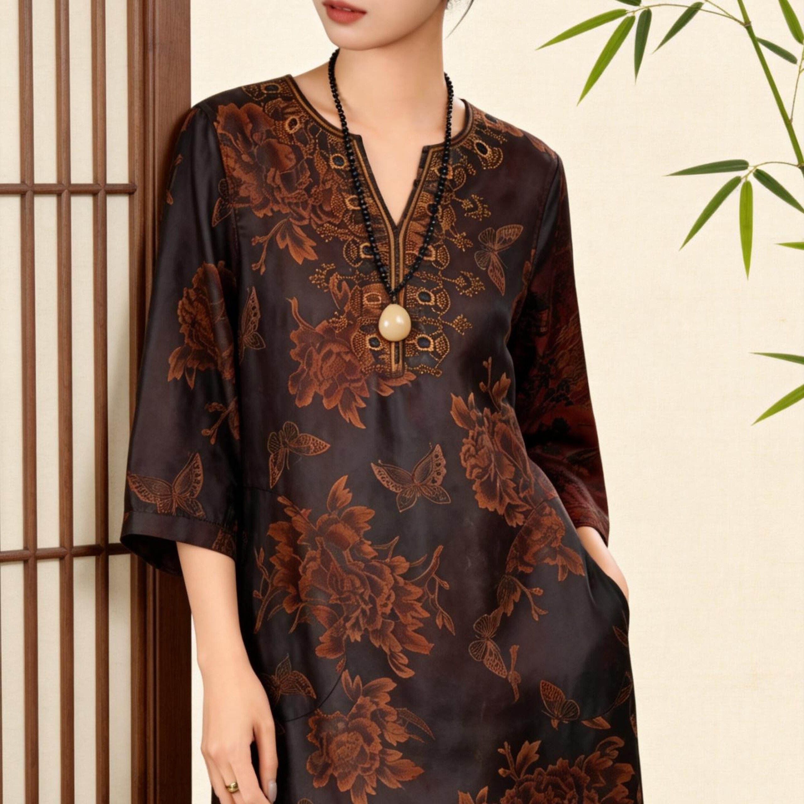 Pre-nine silkworms 100 mulberry silk 26 mu red cloud gauze flower blue background yellow flower V-neck special-shaped sleeve dress