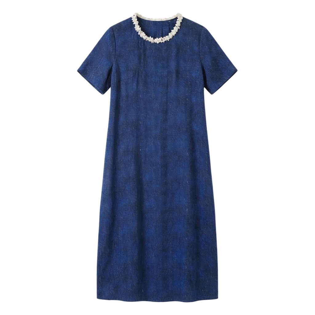 6281-Xiangyun gauze blue dress, women's mid-waist, short-sleeved pearl neck, high-end, elegant temperament long skirt