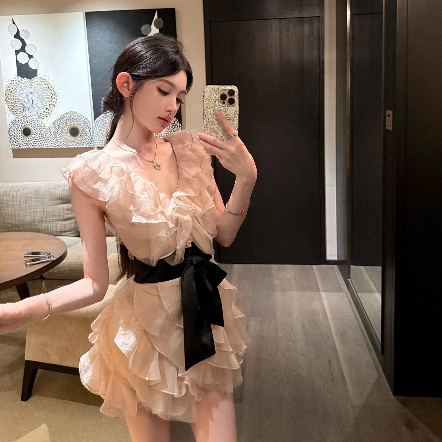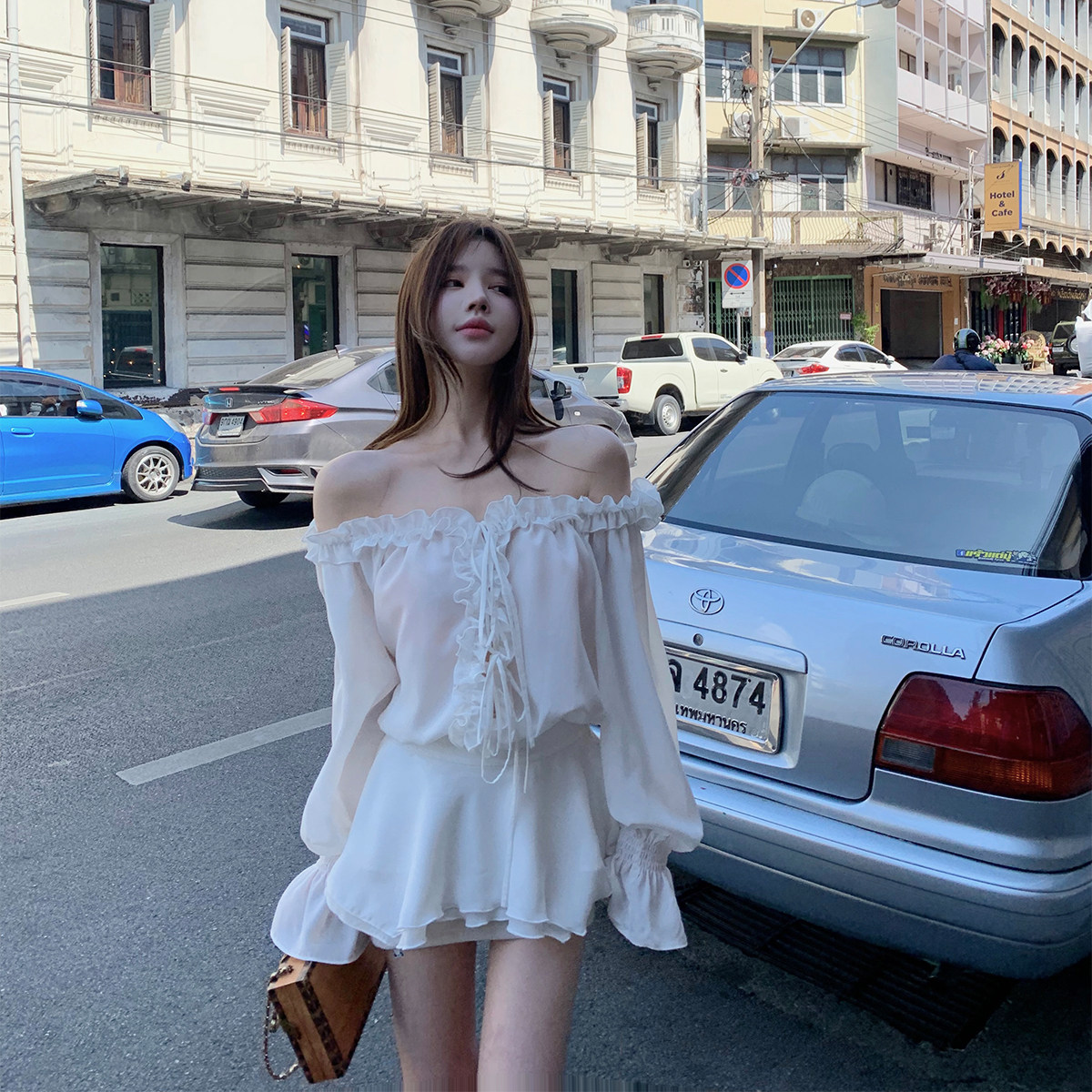 Good morning Fan Fan heavy industry secret torture flower waist shirt skirt women's summer age reduction sweet one-shoulder long top