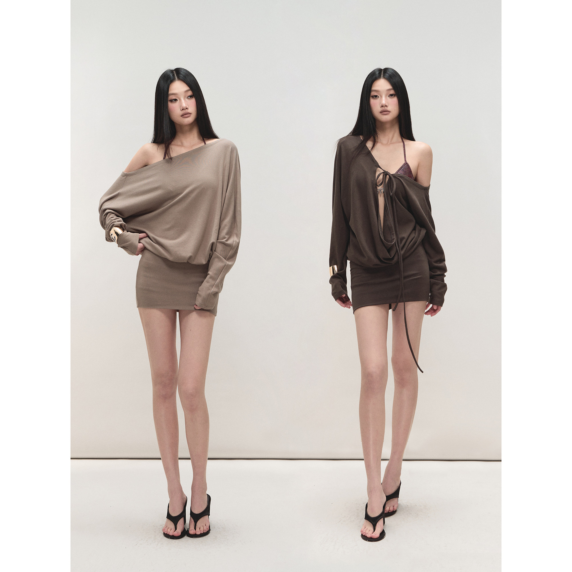 PEMPL Soft Skin-Friendly Sloping Shoulder Two-Piece Dress Women's Loose Lace-up Knit Sexy Backpack Hip Short Skirt