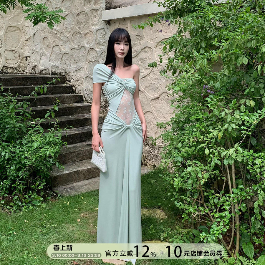 VENUIE bean green dress skirt slanted shoulder seaside resort lace beautiful Sanya French long skirt dress for women