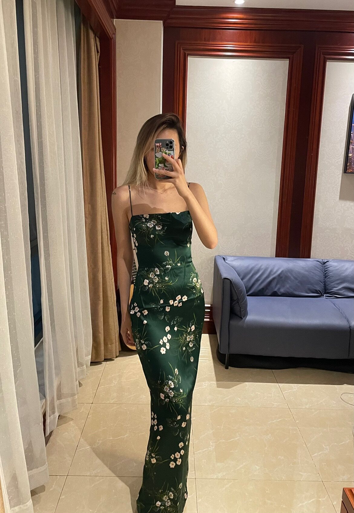Su Closet nine-color small quantity ref full silk luxury green print Frankie back slit camisole dress