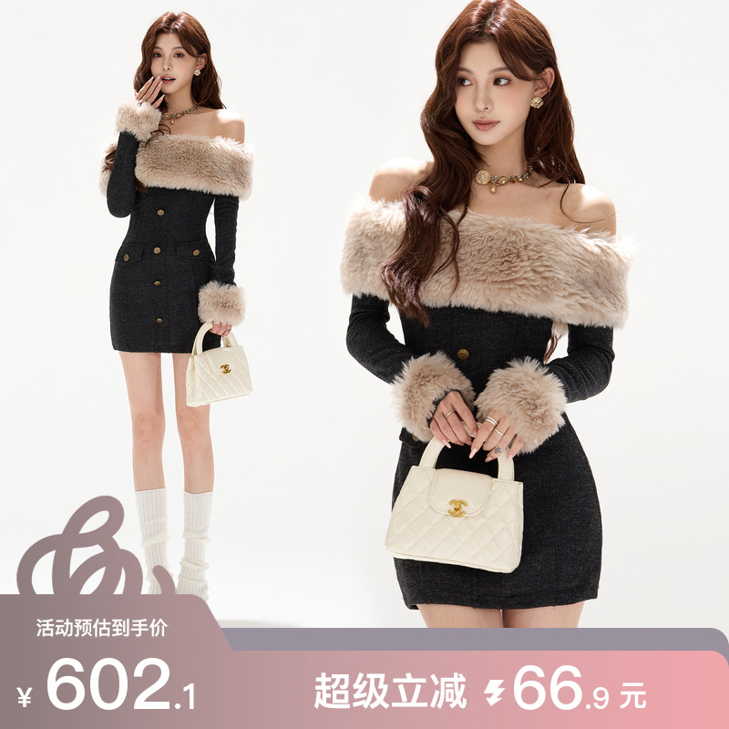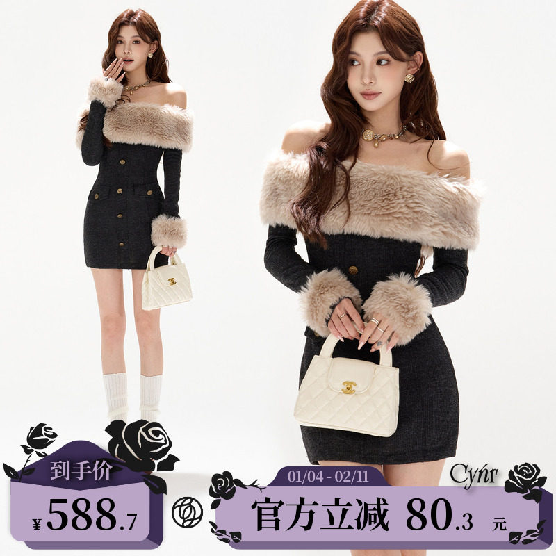 CYNR original design rich daughter sexy fur collar one-shoulder dress slim slim hip knitted skirt
