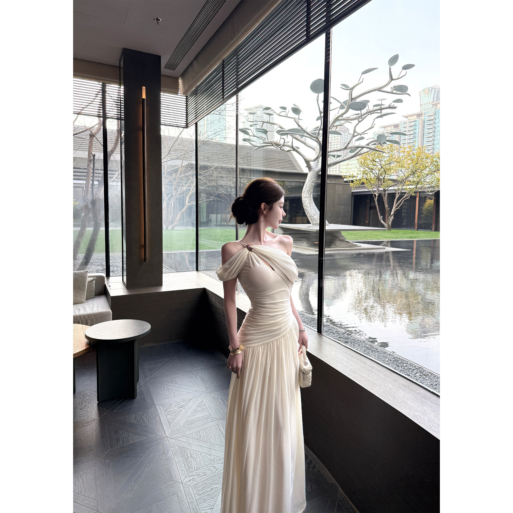 kubiliv [cool and elegant] French atmosphere slanted shoulder twist design long skirt sexy pure desire dress