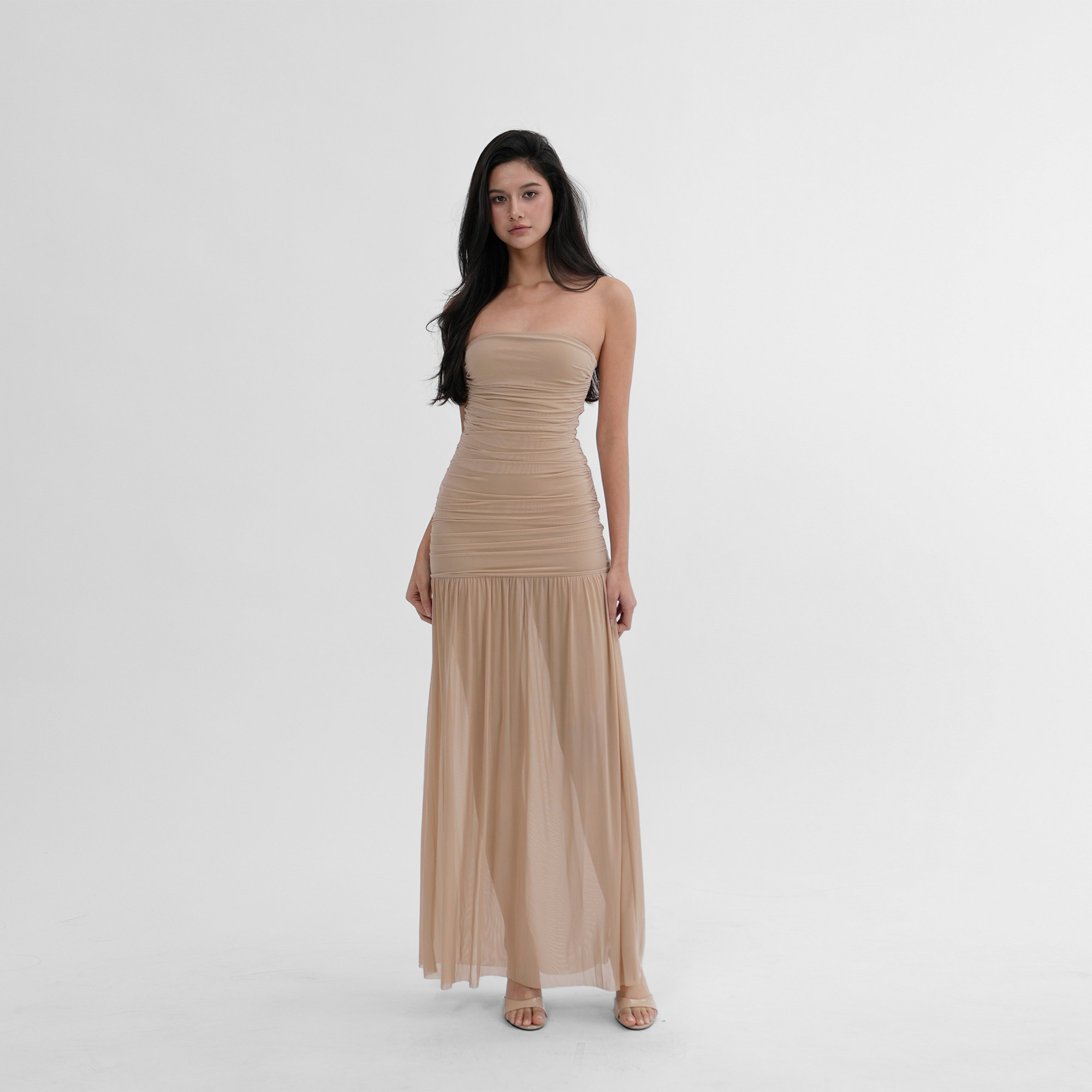 Jim Kennet's bandeau one-line neckline mesh waist and hip dress