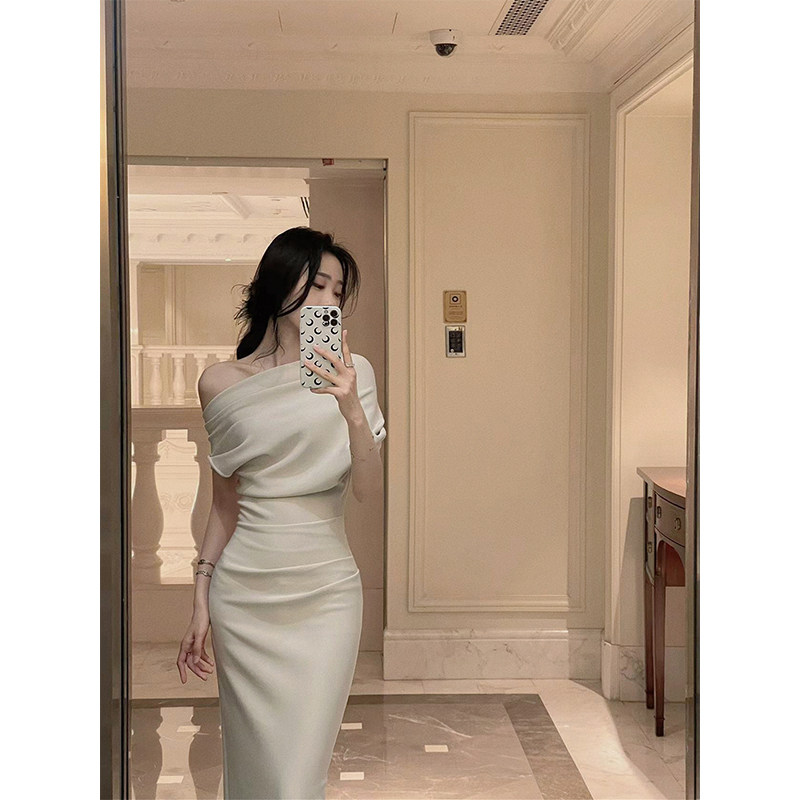 Qian An'an, big off-the-shoulder, sexy short, waist-cinching, temperament, pleated dress, French small dress, dress, women's summer