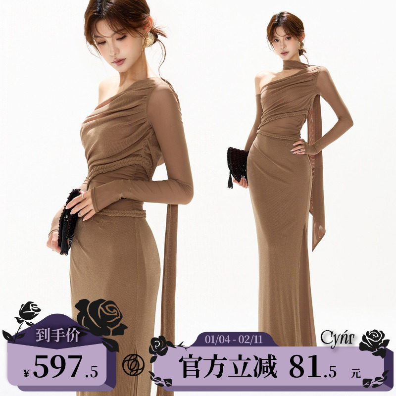 CYNR original design French vintage twist braid mesh cutout splicing slope dress slim gown maxi skirt