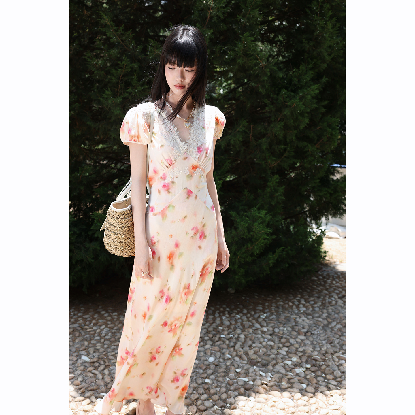 P.tree "Manhattan Fireworks" oil painting lace V-neckline 100% human silk viscose dress