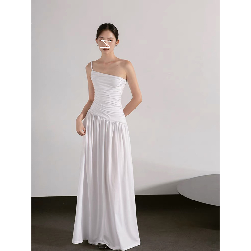 Elegant and simple one-shoulder slanted collar pleated waist A-line skirt summer French sexy slimming chic slip dress long
