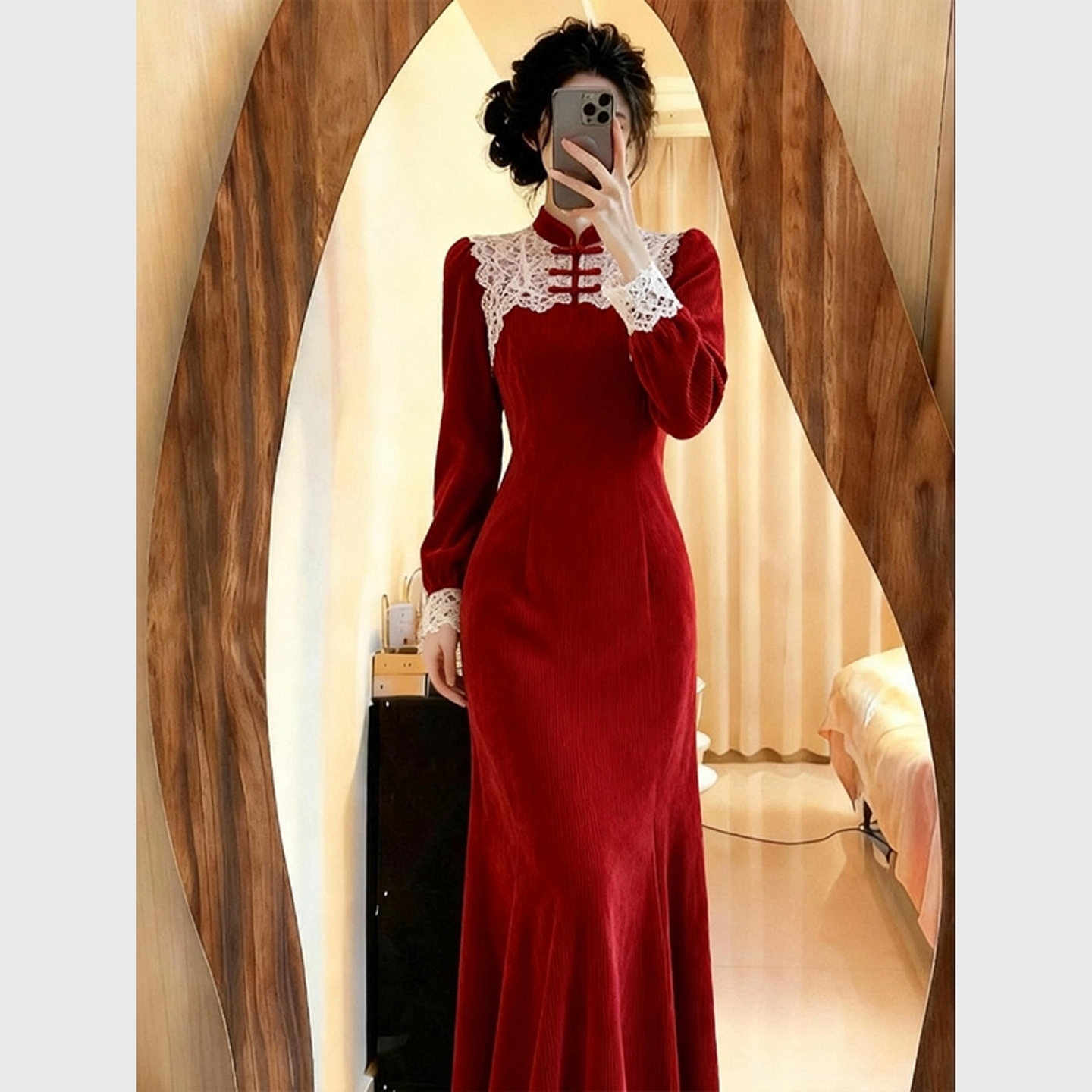 New Chinese women's clothing natal year red lace buckle corduroy cheongsam 25 winter engagement slimming inner dress