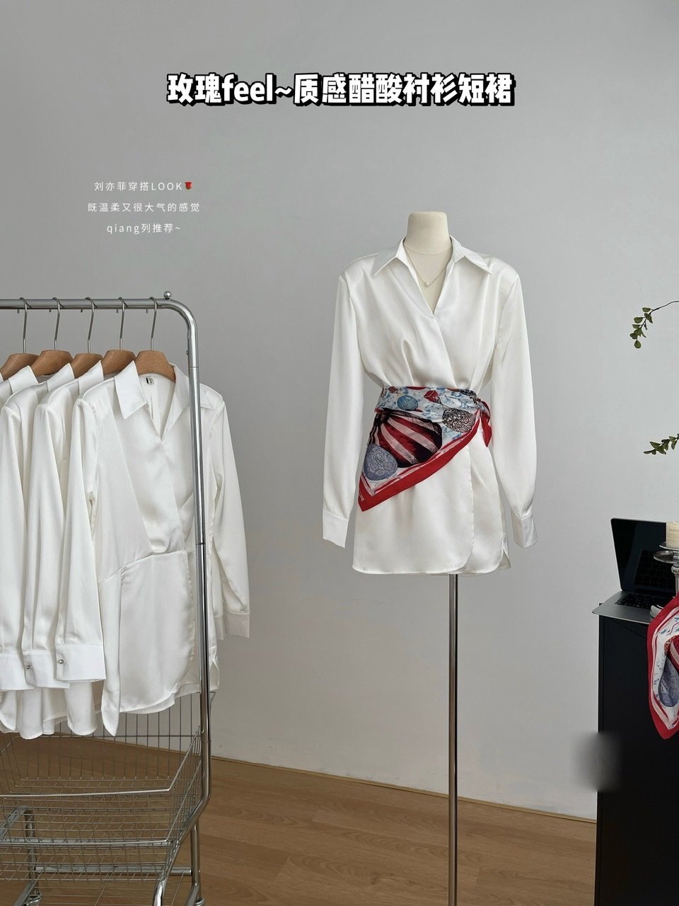 Peach homemade rose feel texture acetic shirt dress short skirt niche V-neck white dress tie clip