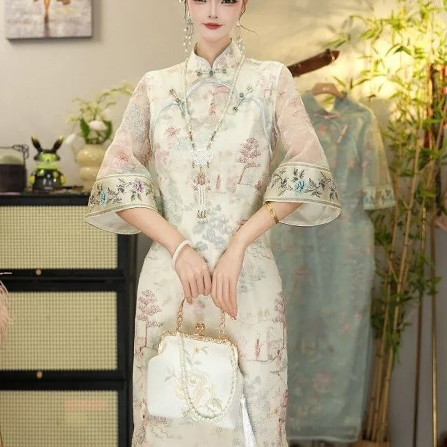 New Chinese style improved cheongsam stand-up collar buckle dress women's new summer temperament slimming five-quarter sleeve long skirt