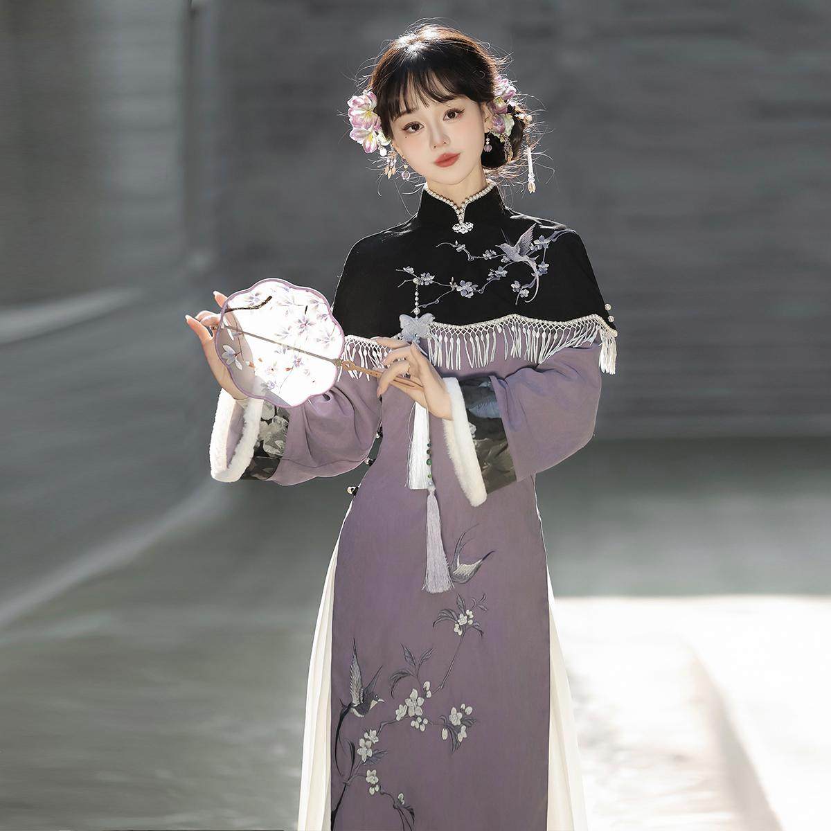 Special price Wen Yangui improved new Chinese purple cheongsam shawl skirt set retro gentle temperament dress