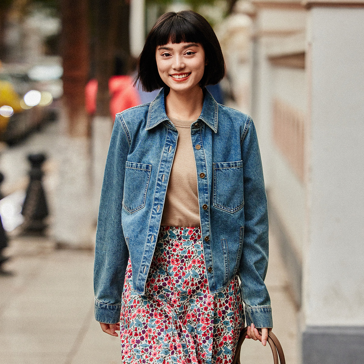 Xiaozhong "Hong Kong style denim" jacket with four seasons with a hem and waist short, cotton spun antique casual women's shirt-style top