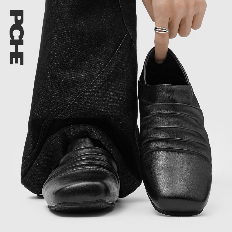 Puchen PUCH pleated design, square toe, black retro half-slippers, men's and women's casual ballet shoes, breathable small leather shoes
