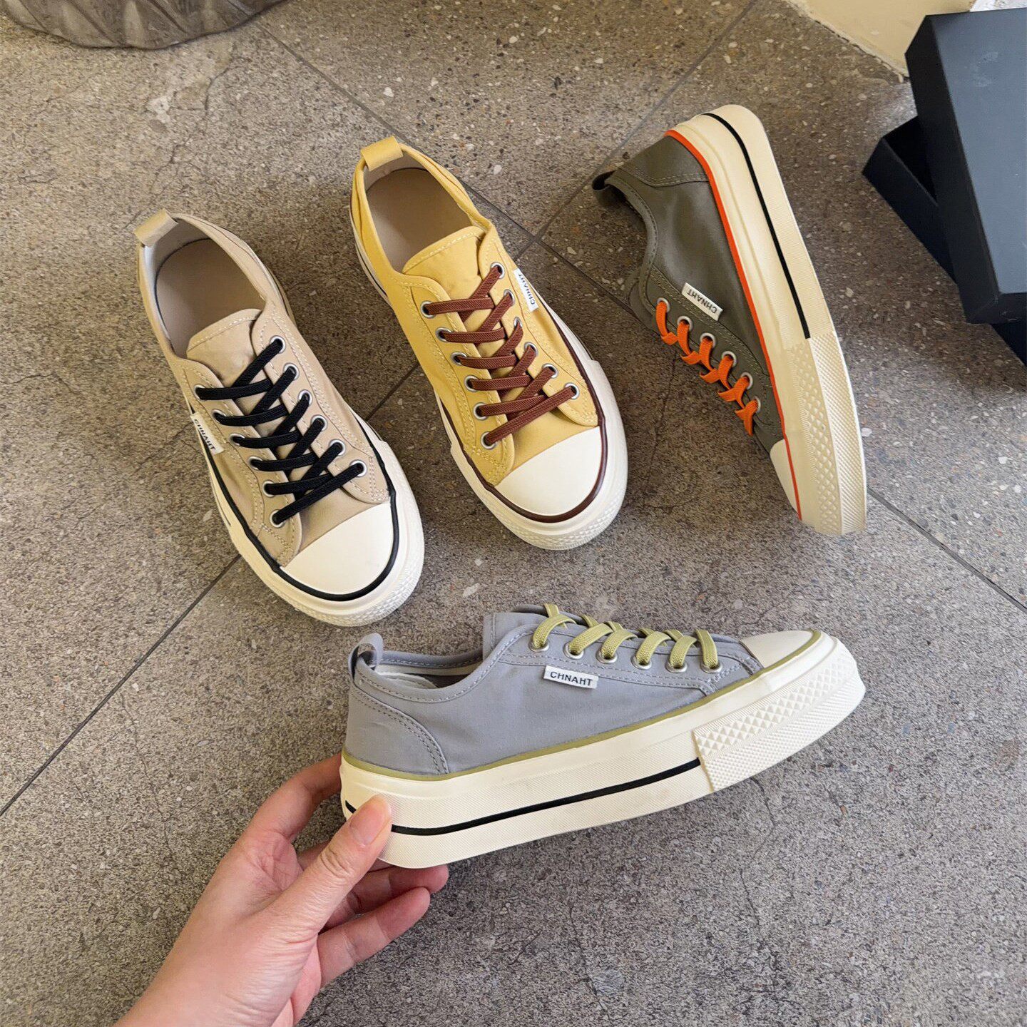 Italy SANLI ~ simple fashion platform canvas shoes women's contrast lace-up round toe versatile comfortable casual board shoes