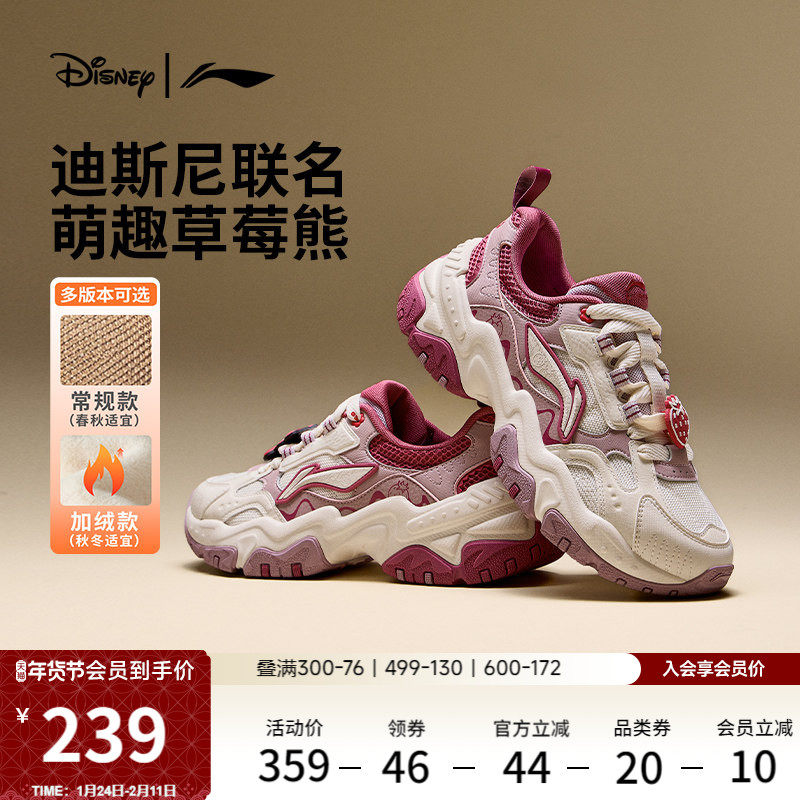 Li Ning brown sugar Disney strawberry bear co-branded丨Casual shoes women's new winter fleece daddy shoes sports shoes