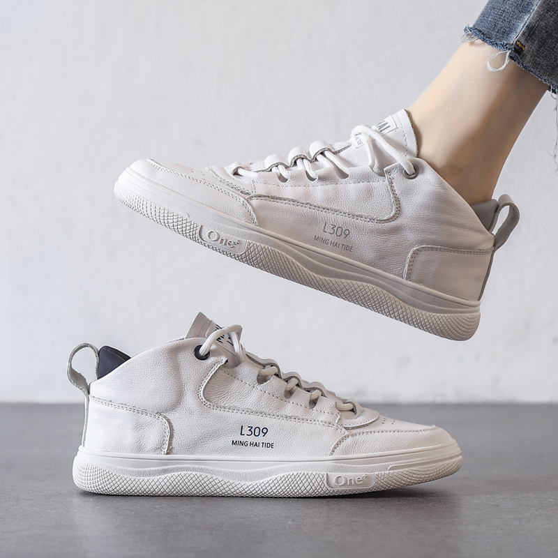 Hong Kong top-layer cowhide high-top board shoes women's 2025 spring and autumn new versatile leather thick-soled casual sports white shoes