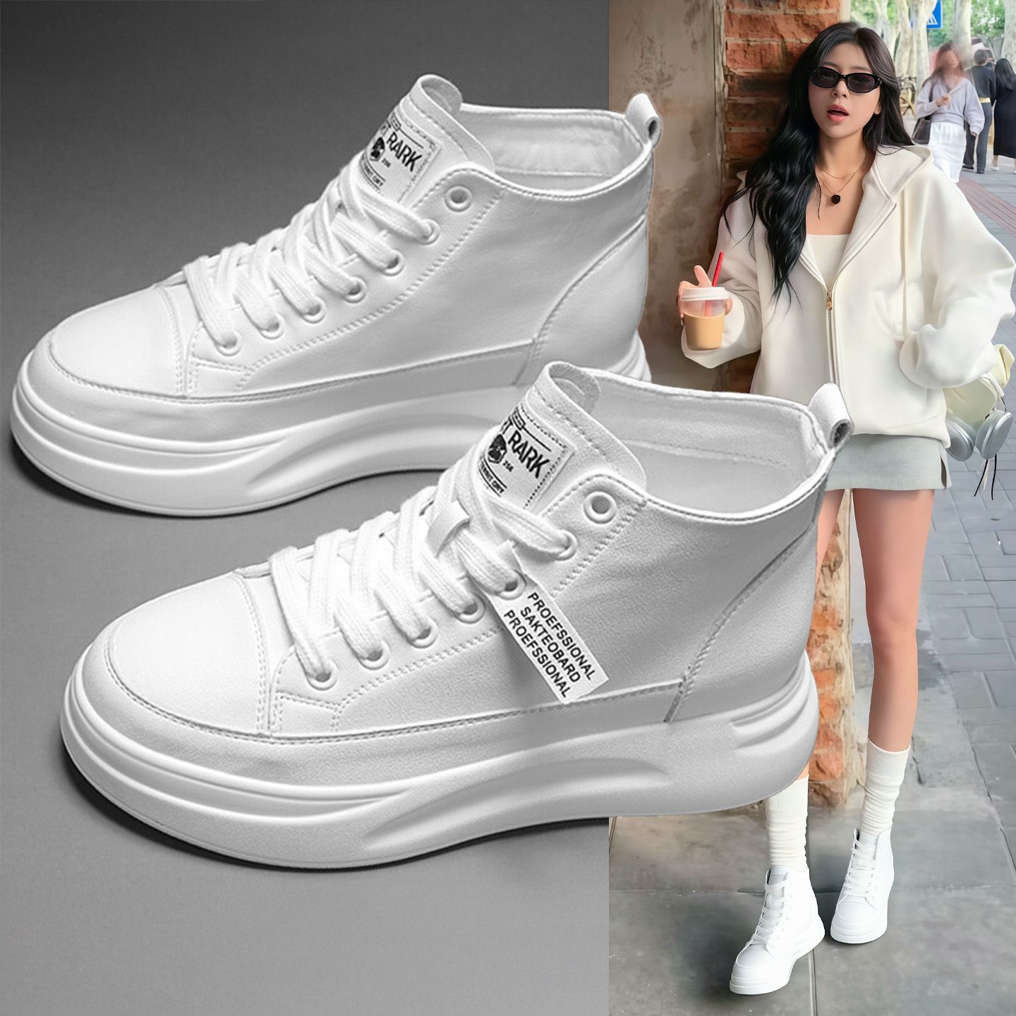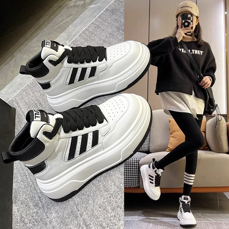Hong Kong high-top white shoes women's 2025 spring and autumn new platform shoes versatile height-increasing casual boots leather board shoes